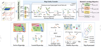 Maps are crucial for various smart city applications as a core component of city geographic information systems (GIS). Developing effective Map Entity Representation Learning methods can extract semantic information for downstream tasks like crime rate prediction and land use classification, with significant application potential. A map comprises three entity types: land parcels, road segments, and points of interest. Most existing methods focus on a single entity type, losing inter-entity relationships and weakening representation effectiveness for real-world applications. Thus, jointly modelling and representing multiple map entity types is essential. However, designing a unified framework is challenging due to map data’s unstructured, complex, and heterogeneous nature. We propose a novel method, HygMap, to represent all map entity types. We model the map as a heterogeneous hypergraph, design an encoder for map entities, and introduce a hybrid self-supervised training scheme. This architecture comprehensively captures the heterogeneous relationships among map entities at different levels. Experiments on nine downstream tasks with two real-world datasets show that our framework outperforms all baselines, with good computational efficiency and scalability.